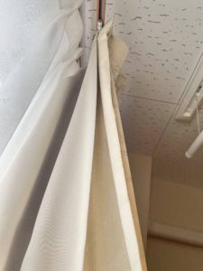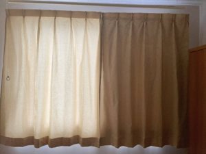 既存のカーテンに簡単に取り付けられる簡易裏地を遮光二級の生地でお作りしました。お色はカーテンに合わせてお選びしています。二級でもカーテンと二重になるので十分日差しを遮ります。また二重になることで保温性もアップするので冬にも役立ちます。