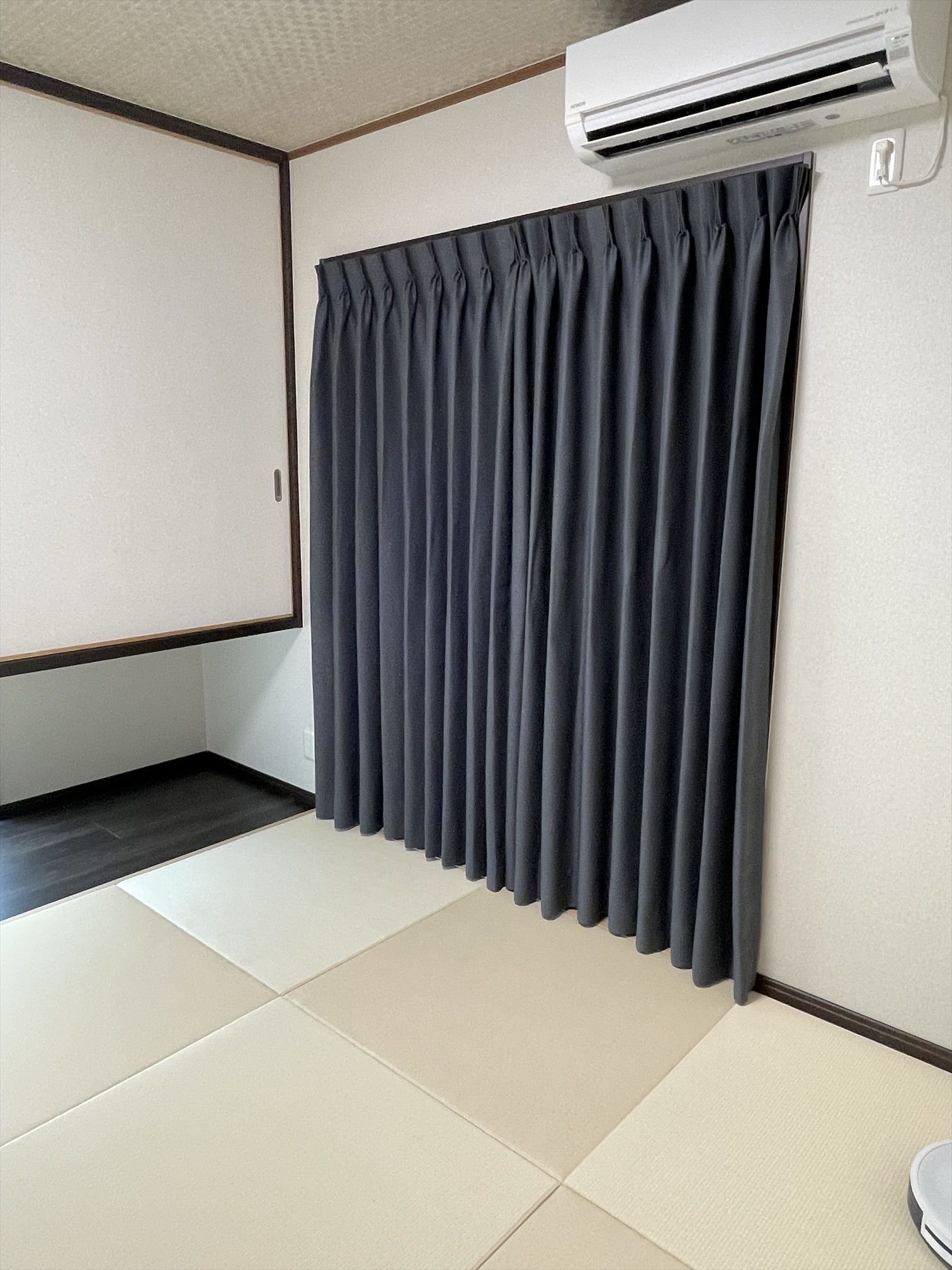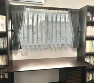 作り付けの棚があったため、カーテンレールを棚の高さと同じ位の所になるように窓枠に取付けしております。
