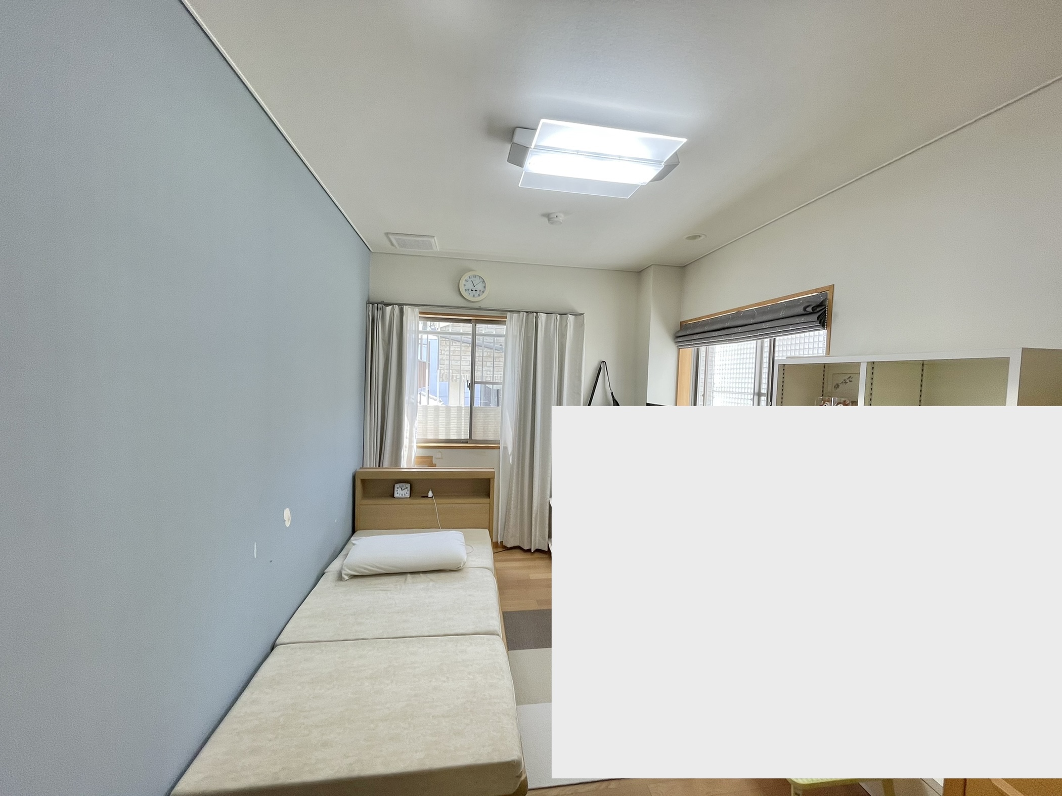 これまではホワイトをメインとしブルーのアクセントクロスで男の子らしいお部屋でしたが、ご長男ももう大学生になったことと、物をぶつけて何ヶ所か穴が開いていたところも修繕ご希望だったのでクロス張り替えとなりました。