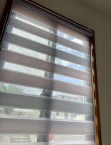 向かい合う窓にグラデーションのレースカーテンをお納めしております。調光ロールスクリーンも同じようにグラデーションの生地をお選び頂きました。