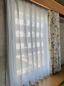 こちらも北向きの窓に採用いただきました。ブラインドだった時は完全に閉めっぱなしでしたが、レースから光も入り、またカーテンに施された刺繍のレモンも見て楽しめます。レースはレモンの葉っぱを意識して薄いグリーンで。ブラインドだった時とは全く違う雰囲気になりました。