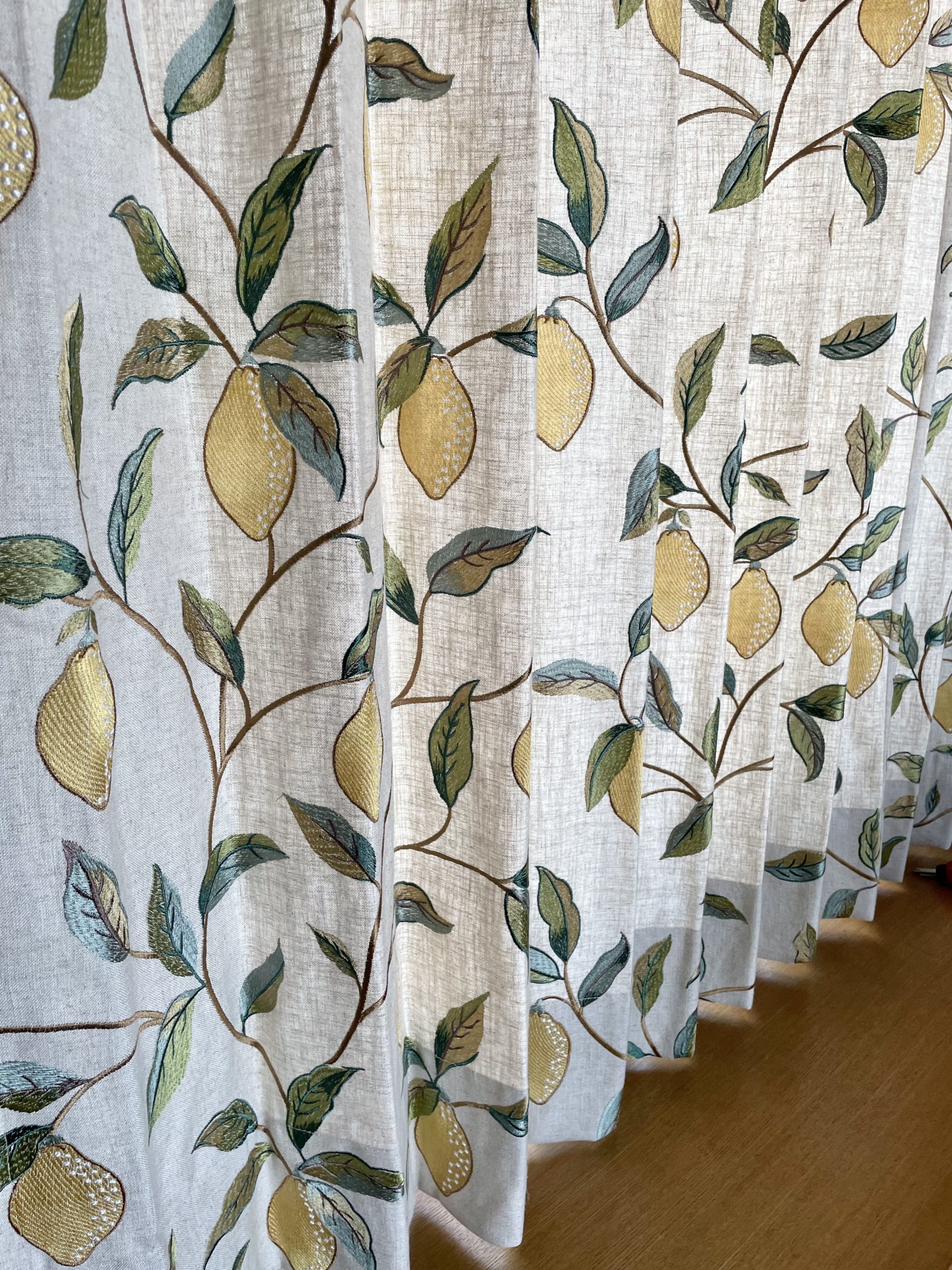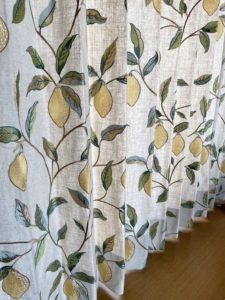 こちらも北向きの窓に採用いただきました。ブラインドだった時は完全に閉めっぱなしでしたが、レースから光も入り、またカーテンに施された刺繍のレモンも見て楽しめます。レースはレモンの葉っぱを意識して薄いグリーンで。ブラインドだった時とは全く違う雰囲気になりました。