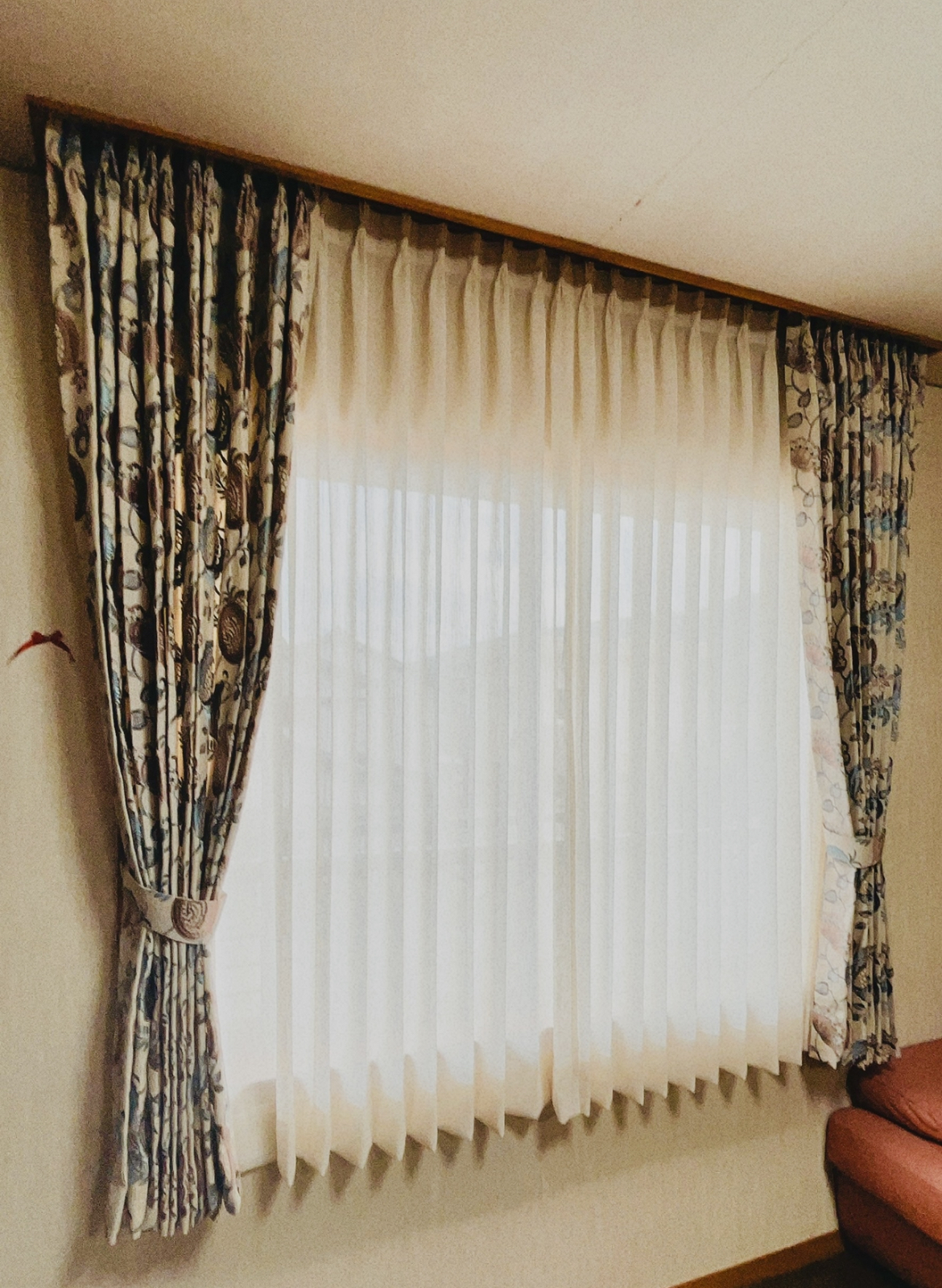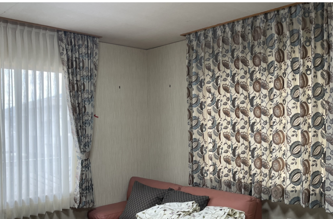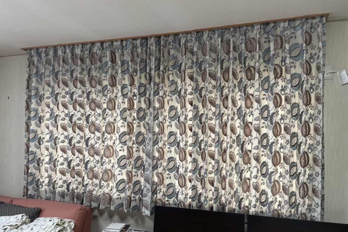 以前使われていたカーテンも輸入生地でお作りさせt頂きました。テイストが全く違うものとなっておりましたが、優しいパステルカラーの様なお色が入っていたのでとっても可愛い印象となりました😊お客様も、「以前のものとは全然違っていて可愛い!」と仰られました✨