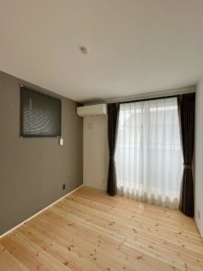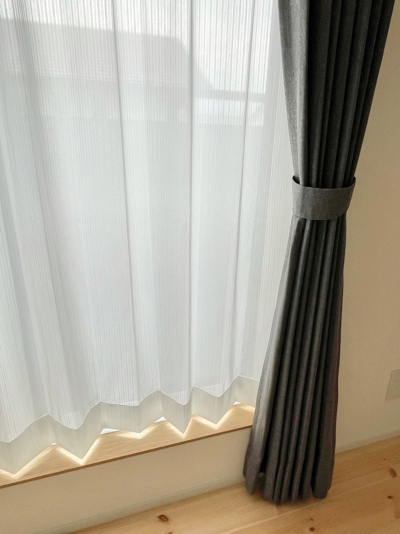 もう一方のお部屋はクローゼットのドアが窓に干渉するため、レース側のレールは窓枠内に収め当たらないようにしました。