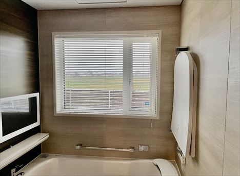 【ご購入の理由】 ご新築 【お納めした商品】 アルミブラインド(ノンビス仕様) RDS付 【メーカー】 タチカワブラインド パーフェクトシルキー T-4522 【今回のポイント】 浴室に取付けさせて頂きました。フッ素コート・遮熱コートの付いたものとなっております。 自動降下機能が付いたものをお選び頂きましたので、降ろす時の勢いは機能が付いていないものと比べると、緩やかに降りるようになっております。 written by えんじ