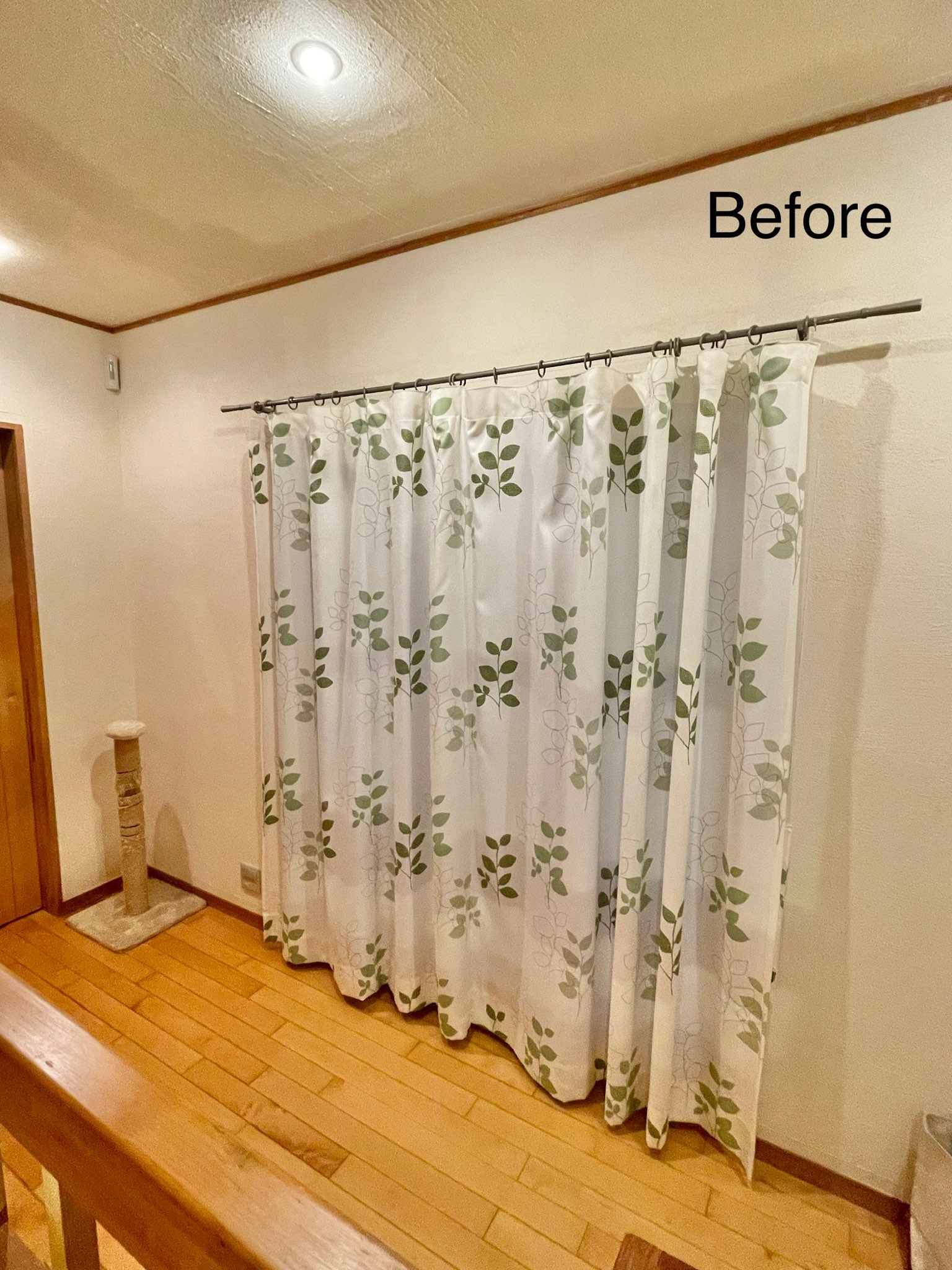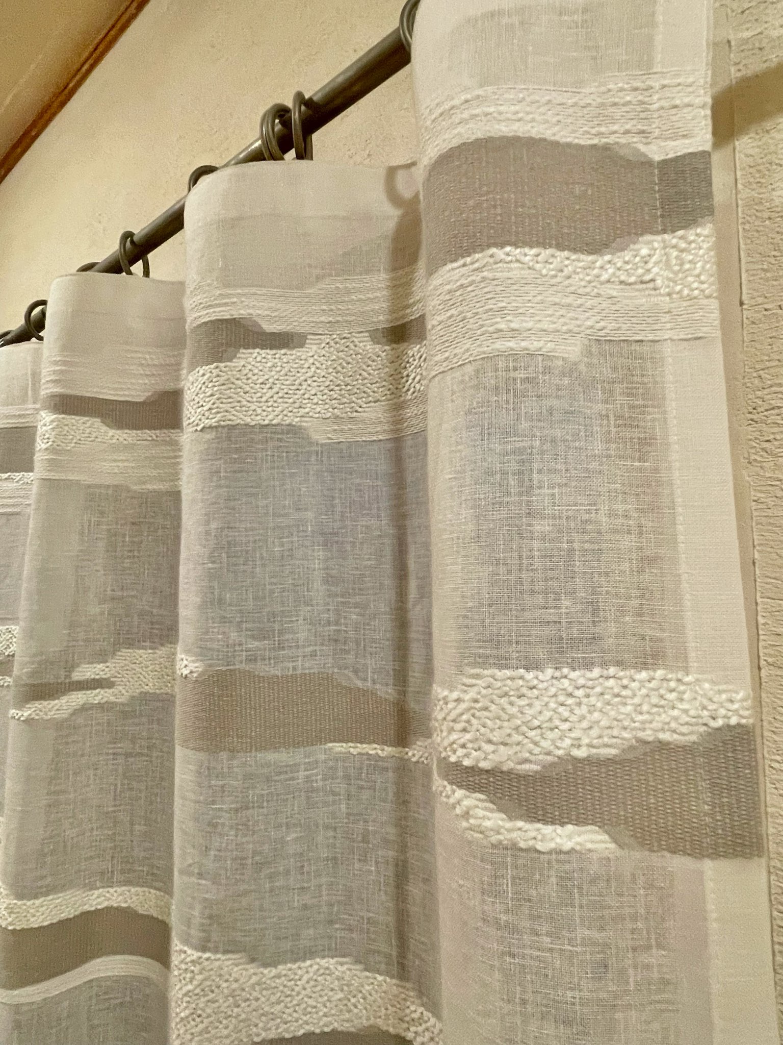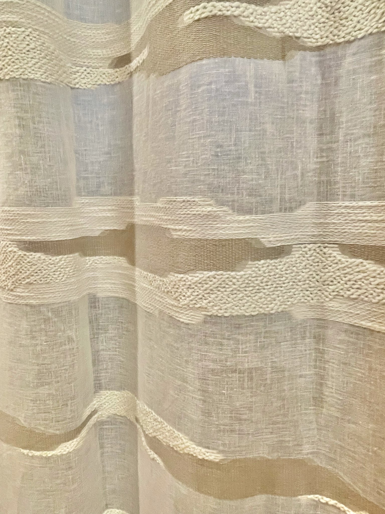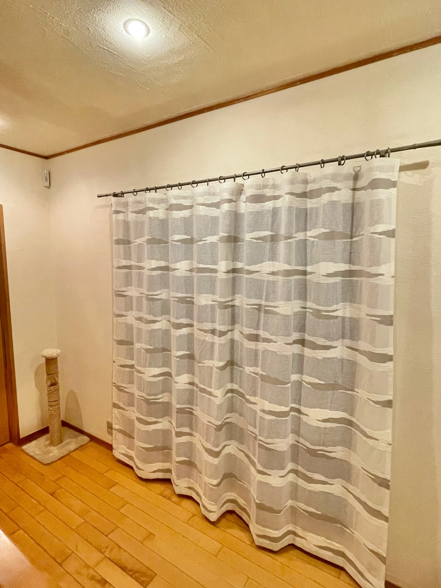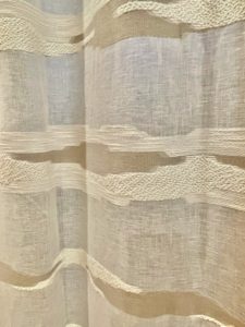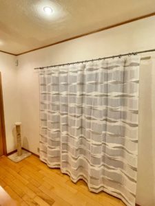 廊下部分の窓は北向きなので直射日光が入らず、本当はもう少し透け感があるものがいいと思っておられたそうですが(しかし向こう側のサッシが透けて見えるほど薄いのはNG)ちょうどいいものがなく普通のカーテンをかけておられました。店頭にディスプレイしていたTaigaがお目に留まり、現地で試着してご採用いただきました。撮影時は日が暮れていましたが、昼間も厚すぎず薄すぎずの透け感でよかったとおっしゃっていただきました。