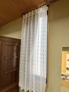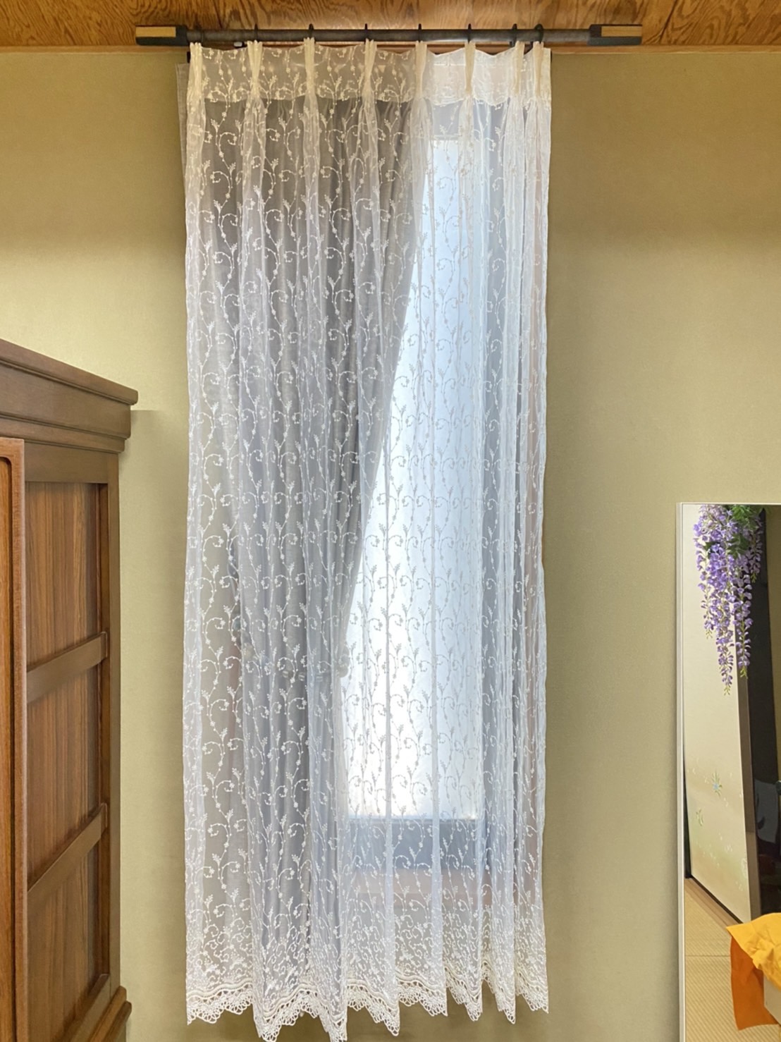 エイプリルはとても薄手のオーガンジーレースですが、こちらの窓ガラスにはもともと和紙のようなものが挟み込まれているので薄手のエイプリルでも問題ありません。大人っぽさの中にも可愛らしさのあるコーディネートとなりました。