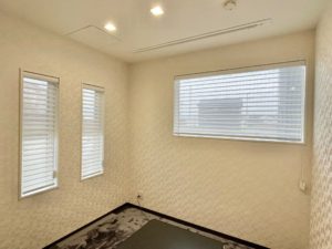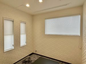 店頭にディスプレイしていた調光ロールスクリーンを気に入られ、リビング横のタタミコーナーに採用いただきました。当初はノーマン社のものをご検討でしたが、小窓は網戸が付くため窓枠内に取り付けるにはスペース的に厳しいことが分かり、FUGAに決定しました。