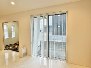 向こう側からの視線があまり気にならない立地のため、シングルでも問題ないと判断されました。ダイニングテーブルなどを置いた時、周辺の動線を考慮して窓枠の中に収めることになり、スラット幅も細い方の80㎜にしました。