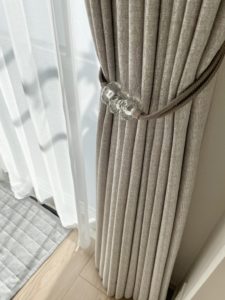最初は柄物や遮光カーテン、輸入生地も候補として幅広くご検討いただきましたが、最終的に当店オリジナル生地をお選びいただきました。シルバー系のシンプル&モダンな表情のカーテンです。装飾タッセルは本物のガラスで輝きが美しいMANAS-TEXのヌーヴォアステールです。