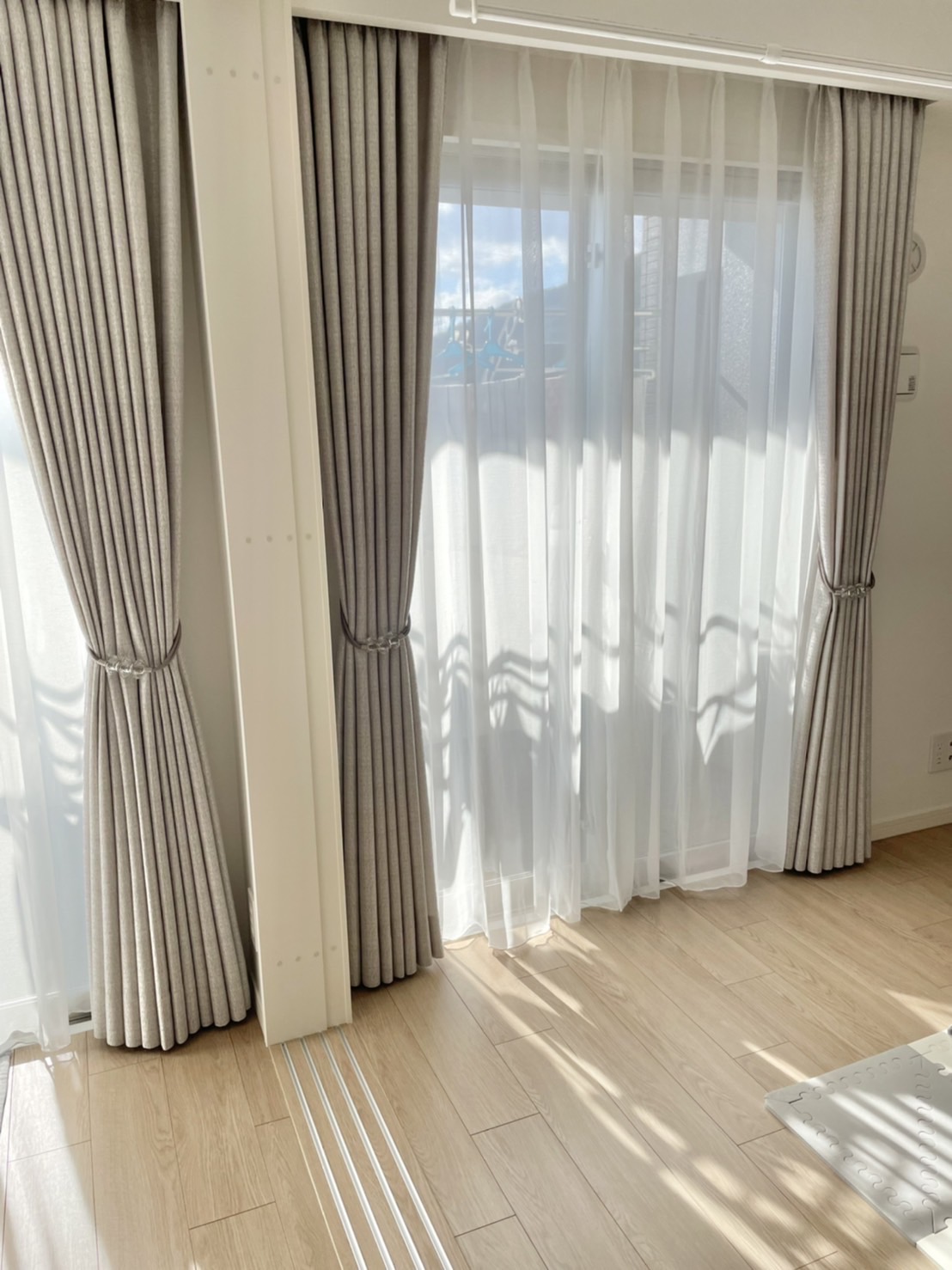 最初は柄物や遮光カーテン、輸入生地も候補として幅広くご検討いただきましたが、最終的に当店オリジナル生地をお選びいただきました。シルバー系のシンプル&モダンな表情のカーテンです。装飾タッセルは本物のガラスで輝きが美しいMANAS-TEXのヌーヴォアステールです。