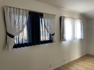 窓の下に机やベッドを置くかも知れないと言う事でしたので、カーテン丈はあまり長くならないようにお作りしております。
